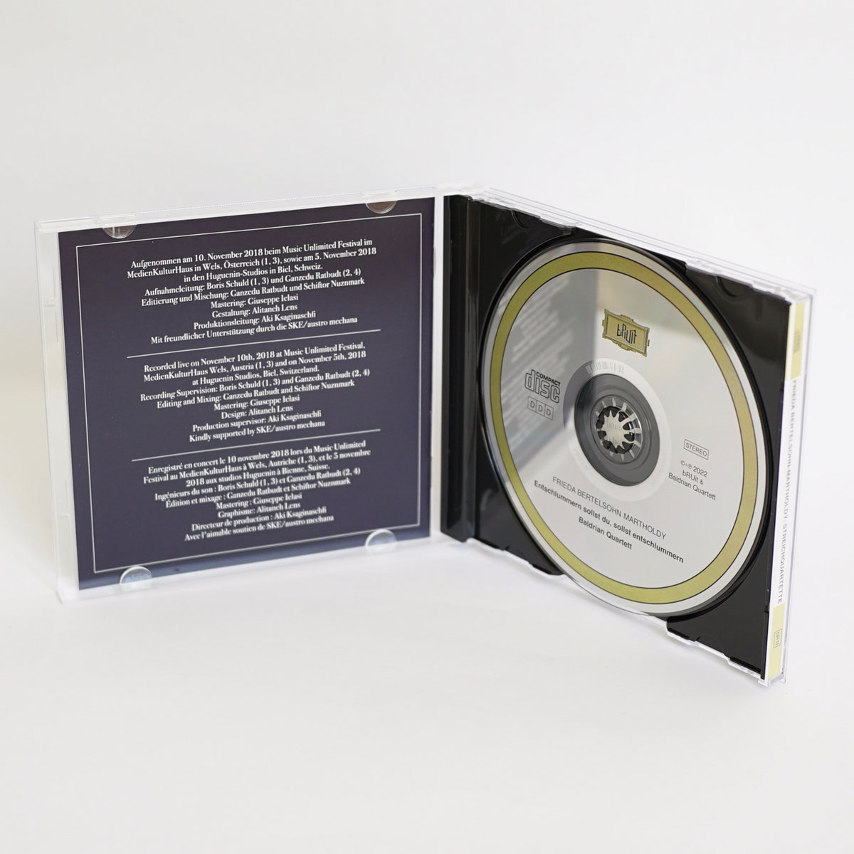 The Baldrian Quartett has established a unique position for itself in the contemporary music world. Coming from the classical repertoire they later sharpened their skills and senses in modern as well as early music practices. Their recent concert programs and releases show a new and unprecedented approach. The four virtuosos reveal unheard sounds from the past. While the quality of their interpretations is second to none, we must also acknowledge their role as true archaeologists of early avant-garde music introducing outsider figures that add invaluable parts to the puzzle of musical evolution. This new album Entschlummern sollst du, sollst entschlummern (engl.: Thou shall slumber, slumber, shall thou) brings us the first ever released recordings of four string quartets by Frieda Bertelsohn Martholdy (1878 - 1907), a composer yet unknown to most of us. The first listening makes undoubtedly clear what an original voice as a composer and what an astonishing achievement from the performers we are witnessing here. Frieda Bertelsohn Martholdys thoroughly modern sounding music fluently integrates a pronounced romantic quality, completely innocent of any of the aesthetic conflicts that 20th century music later challenged providing a candidly bewildering and enriching listening experience. Against the background of it’s origin this music can today be celebrated as a musical sensation. Who would have ever guessed that such a sonic universe could have been created at the end of the 19th century - all four string quartets were composed in 1895 and 1896 - by a young woman in her teenage years? Next to the listening pleasures, it is heartbreaking to read about Frieda Bertelsohn Martholdy’s life in the trilingual 16-page booklet accompanying this CD. In three short essays musicologists Dr. Georgette Oberwies, Inge Salesianer and Franz von Brandenburg introduce us to her music and a life way too short and yet full of hardships and despair, which, in the end, turned out to be unbearable for this sensitive creative mind. The oppression she faced forced her into a new sonic language, though it came at a high price for the young composer. Her music - full of anticipation of practices we have only seen later in the second half of the 20th century – was ignored and rejected at the time and it seems a late reparation that we are now able to acknowledge and appreciate the remarkable music of Frieda Bertelsohn Martholdy. This CD documents recordings of the Baldrian Quartett’s highly praised live performance at the Music Unlimited Festival in Wels, Austria as well as studio recordings from the historical Huguenin Studios in Biel, Switzerland.